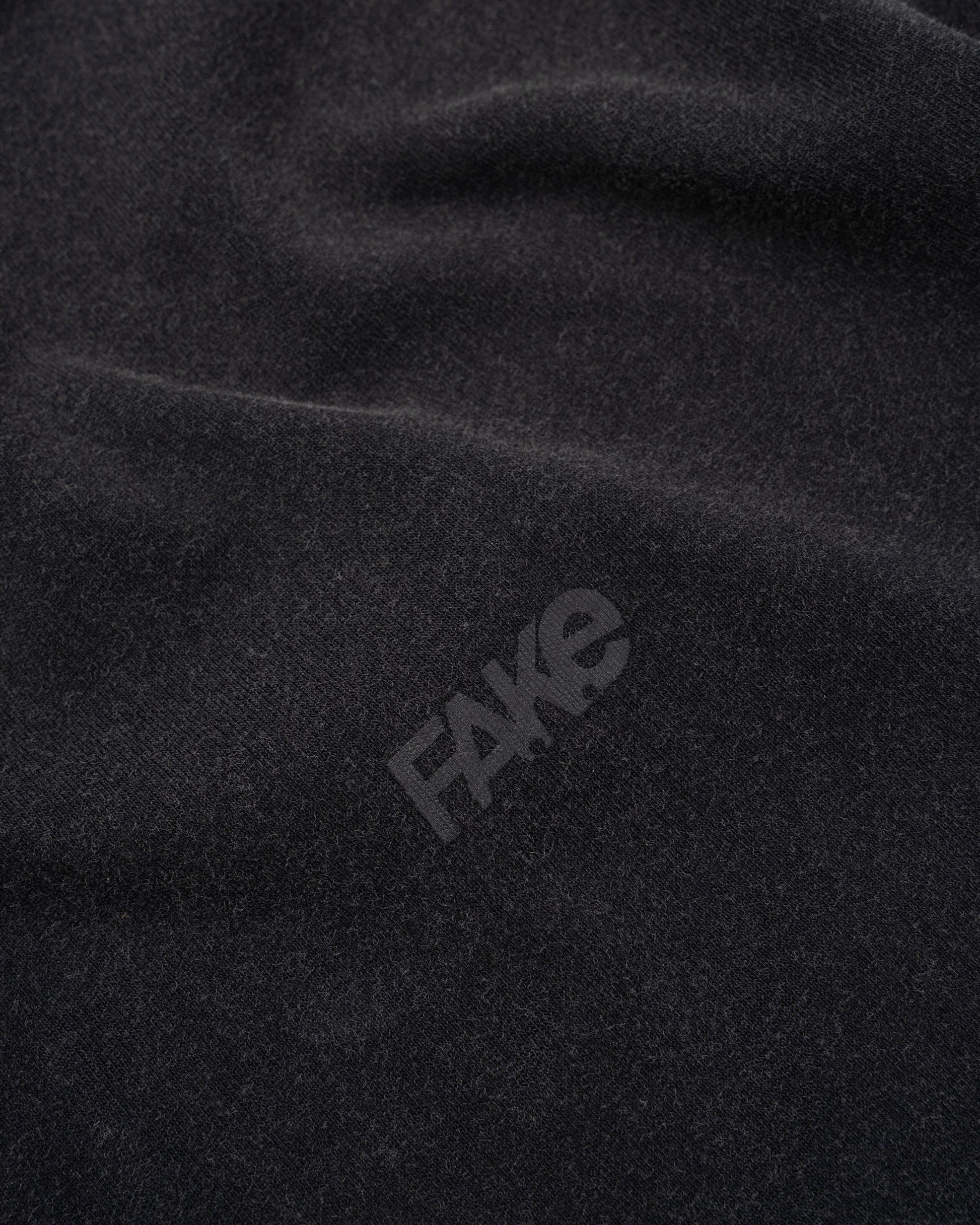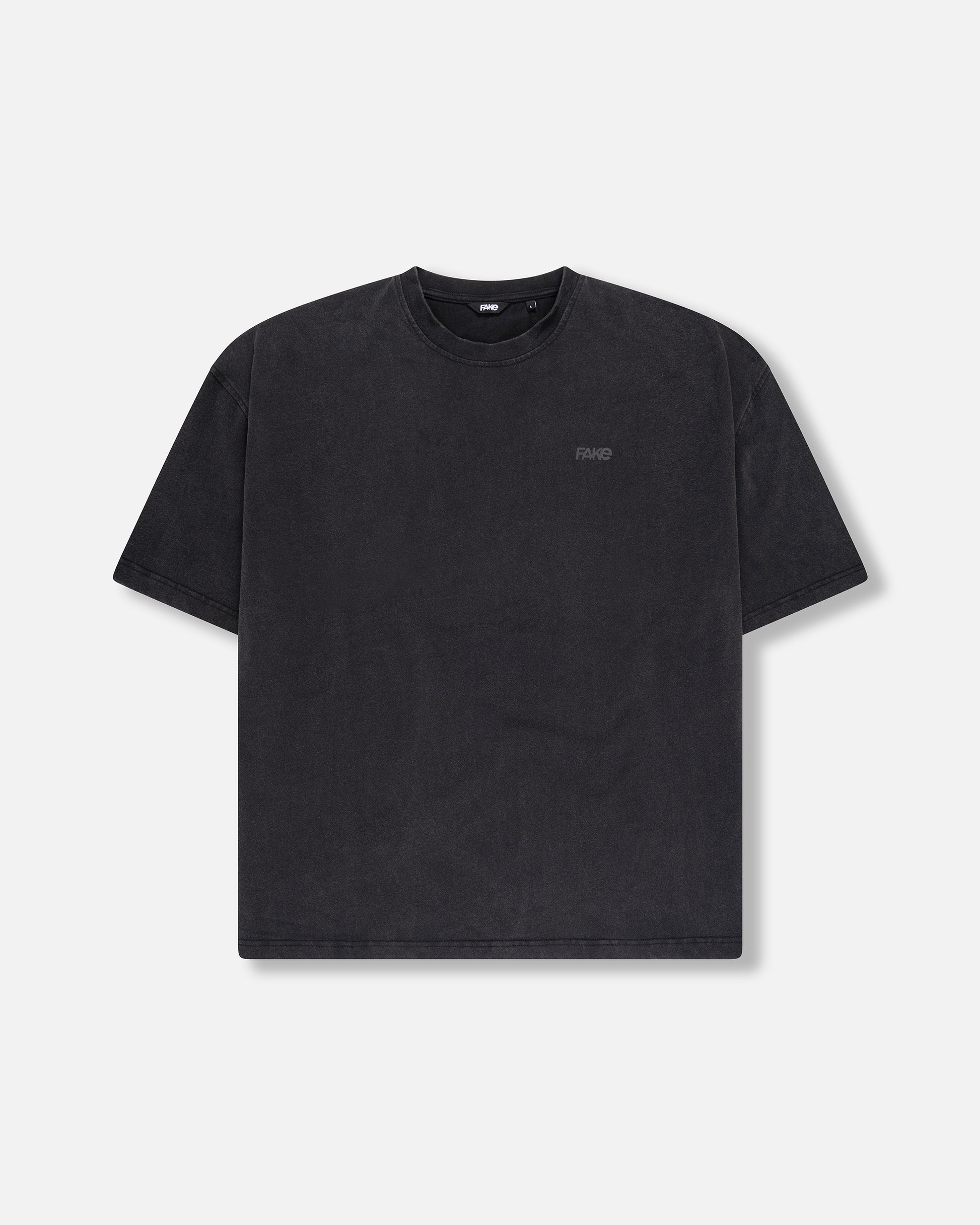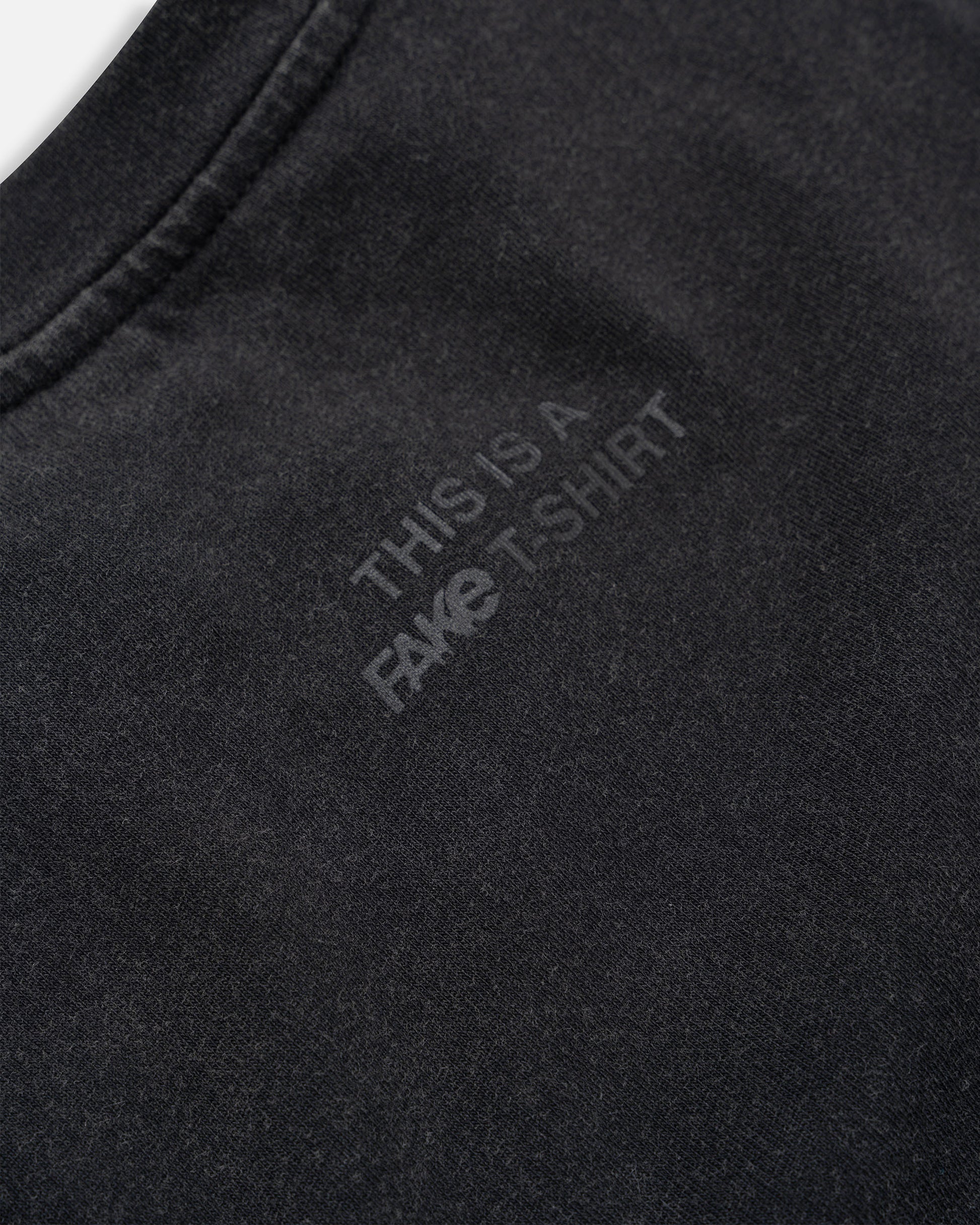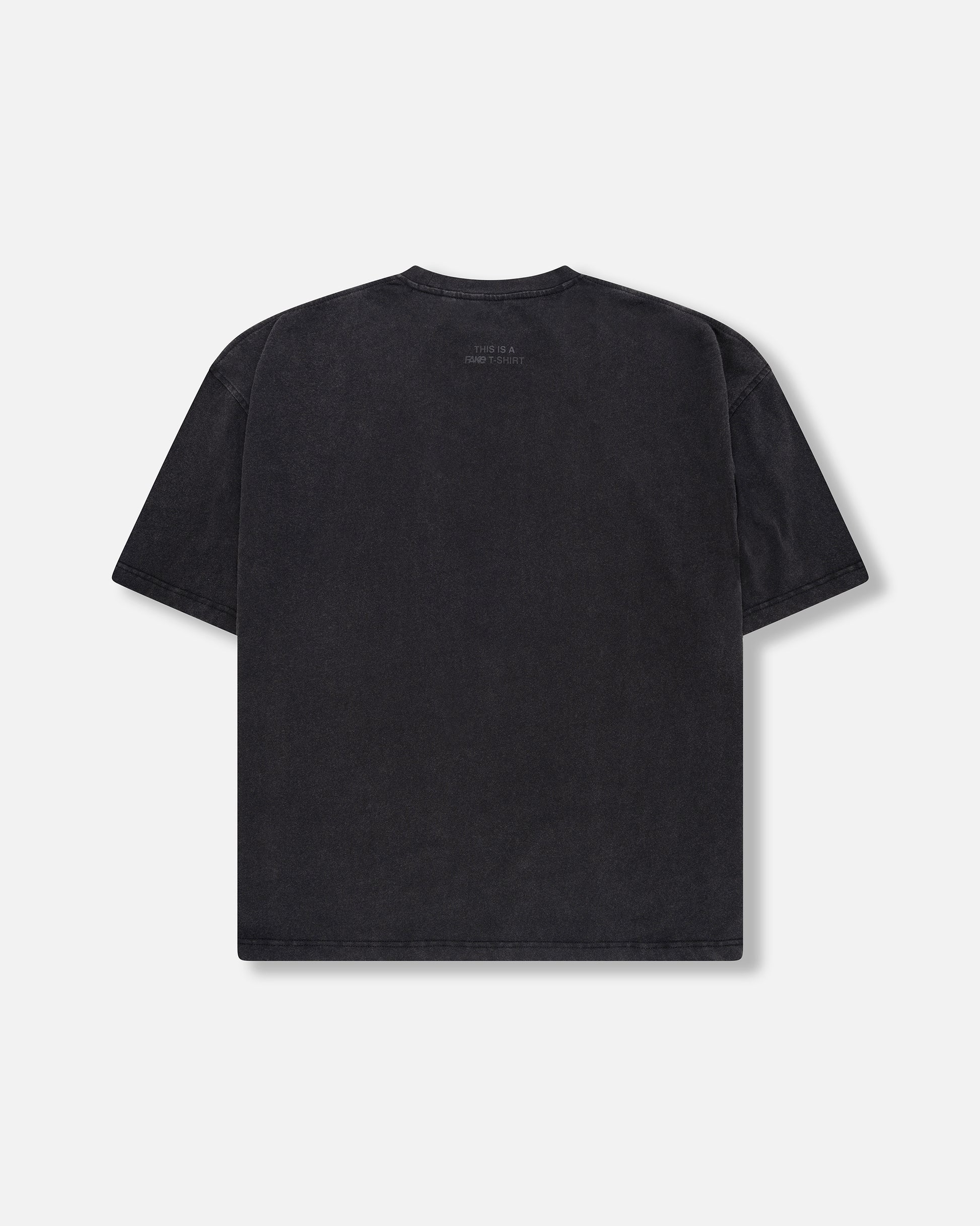 The FAKE Washed Tee carries the weight of simplicity with an edge. Its faded black finish gives it a lived-in feel, like it’s already been part of your story. On the front, the FAKE logo blends subtly with the fabric, almost hidden, a reminder that being real doesn’t always need to be loud. On the back, the message returns: “THIS IS A FAKE T-SHIRT,” stamped above the shoulders as a quiet but undeniable statement.